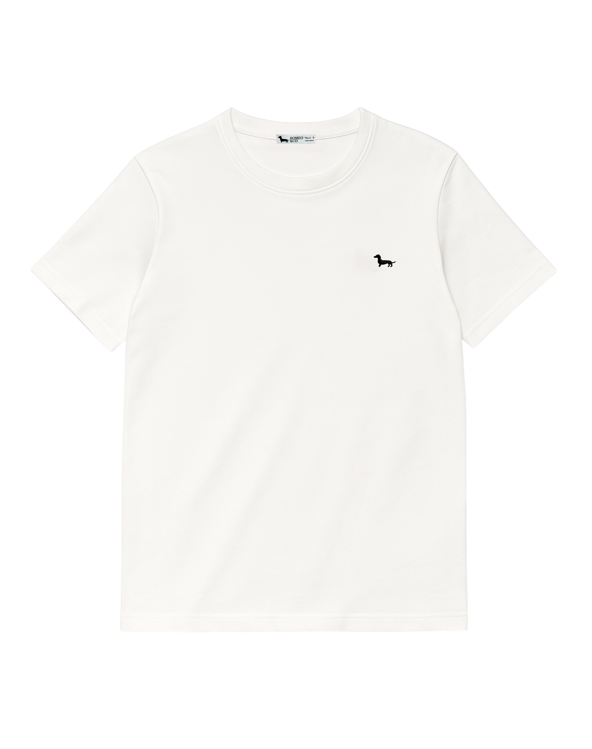 Camiseta de manga corta con cuello redondo y bordado de perrito negro.