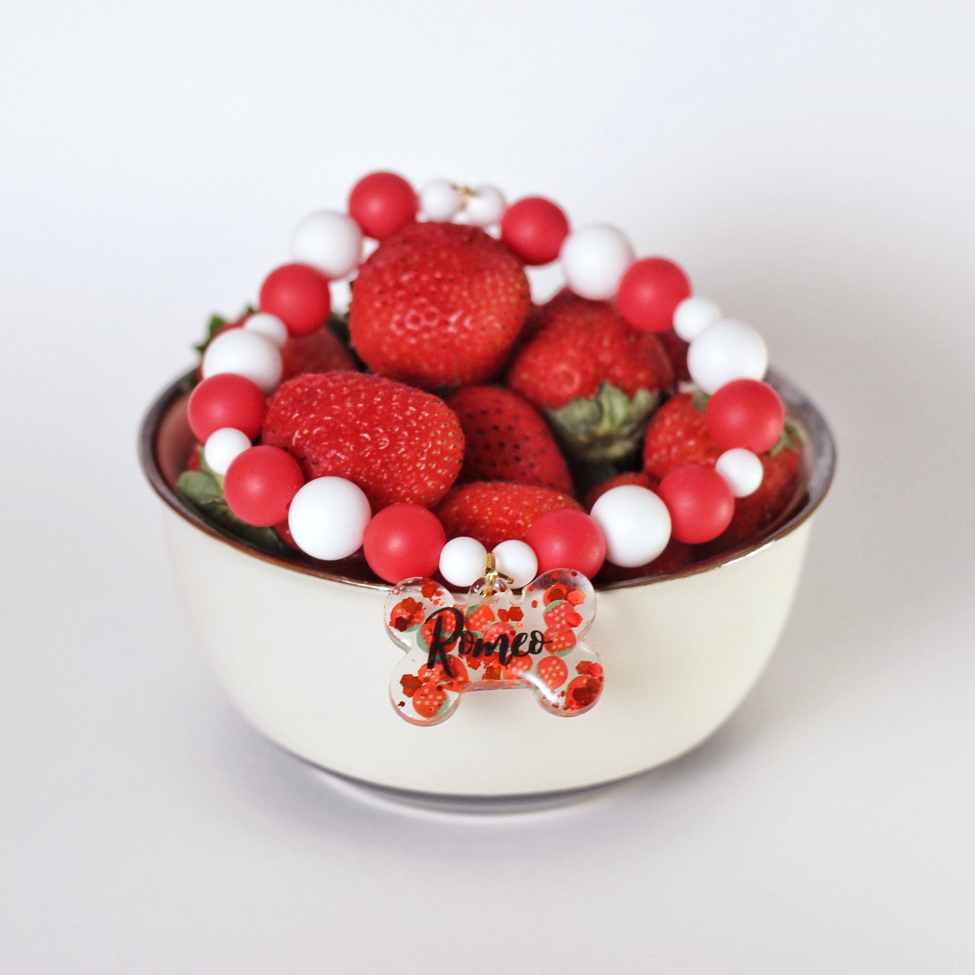 El collar Fresa está pensado para perros que derriten miradas. Su diseño combina esferas en tonos rojos y blancos con pequeños detalles inspirados en la fruta más icónica del verano, evocando frescura, ternura y un toque divertido sin perder elegancia.